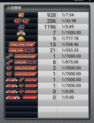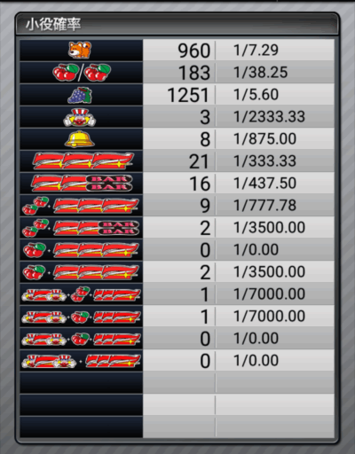 ボーナス合算は設定4の理論値に近く、ぶどう出現率もかなり悪かったので、現実レベルでは「高設定…なのかな?」ぐらいでしょう。