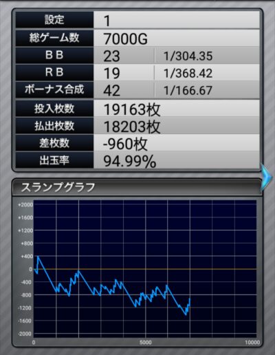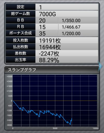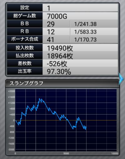 設定1の機械割を見る限り、終日7000G打つとなると、普通に考えれば負けてしまう可能性が高いでしょう。