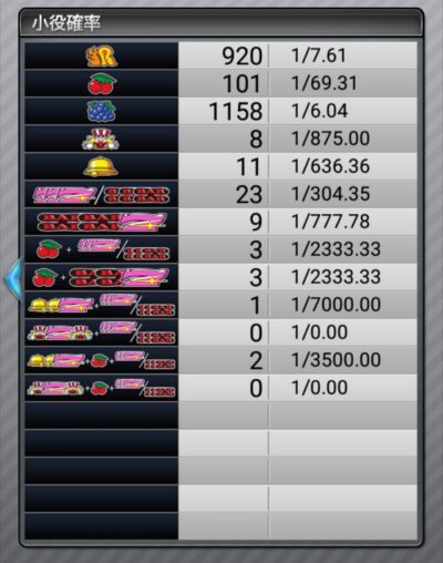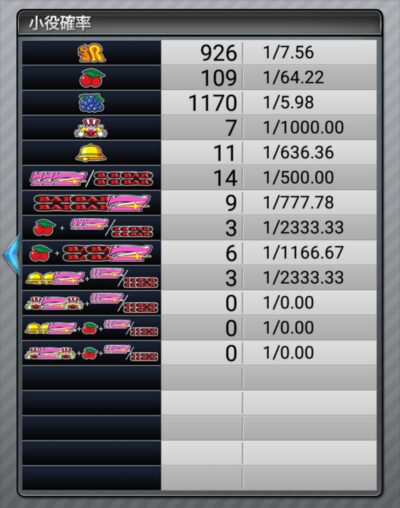 ぶどう出現率はやや良好ですが、ボーナス出現率が悪いので、自身で打っている状況なら終日粘ることはないと思いますね。