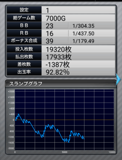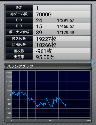 機械割を見る限り、かなり厳しい戦いを強いられそうですが、1日(7000G)単位なら確率がブレる可能性も十分あります。