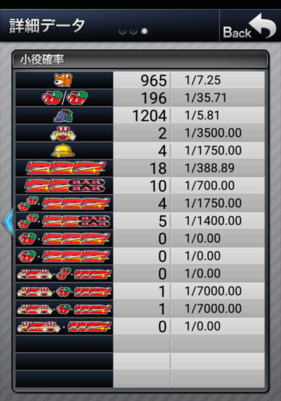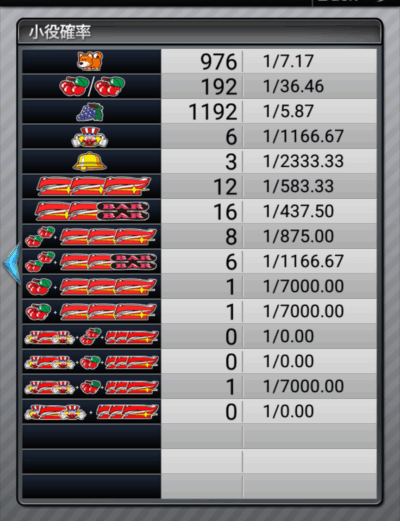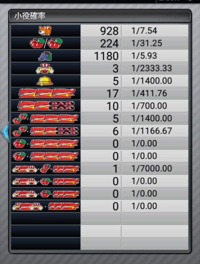 ぶどうの出現率は理論値(これまでの数値)とほぼ同じでしたので、実際に打っていた場合は途中で見切りをつけることもできそうです。